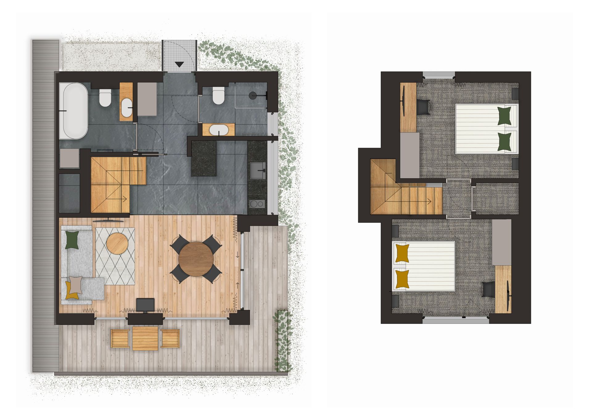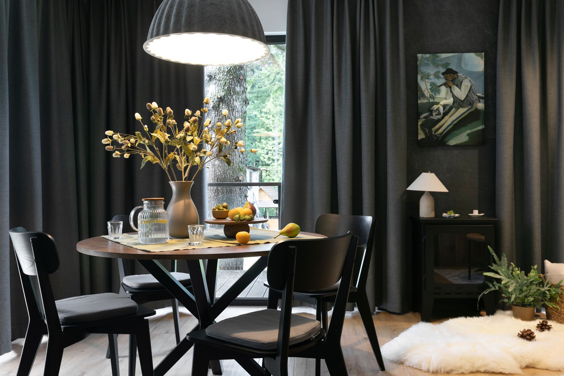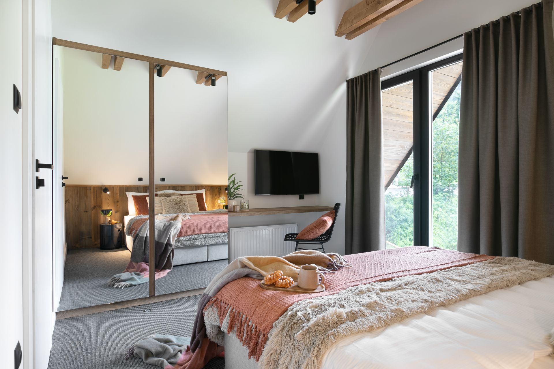 Każdy z domów THE SOPA ma po dwie sypialnie, salon i w pełni wyposażoną kuchnię. Wnętrza są zaprojektowane ze smakiem - gwarantujemy, że nie zostaniesz tu przytłoczony tandetną góralszczyzną, ale za to poczujesz ducha gór i klimat tego niezwykłego miejsca. Lite drewno, skała łupkowa i duże przeszklenia - to właściwie jedyne materiały, jakimi postanowiliśmy Cię otoczyć. Surowość, przełamana akcentami starej fotografii, dobrze koresponduje z nowoczesnością wyposażenia pomieszczeń. Tutaj nie zabraknie Ci dosłownie niczego. Dodatkowo domek posiada ogrodzony ogródek, w którym bez stresu mogą się bawić dzieci czy biegać pies.